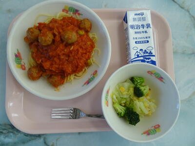 トマトミートボールスパゲティ・牛乳・ゆで野菜