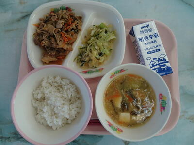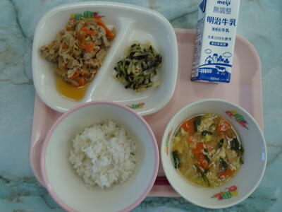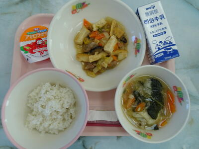豚肉の三昧炒め・大根の磯辺和え・生揚げと卵のみそ汁・麦入りご飯・牛乳