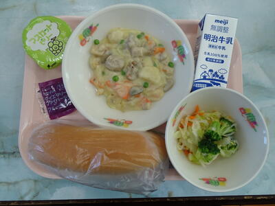 肉団子のクリーム煮・コッペパン・ブルーベリージャム・牛乳・ゆで野菜・マスカットゼリー