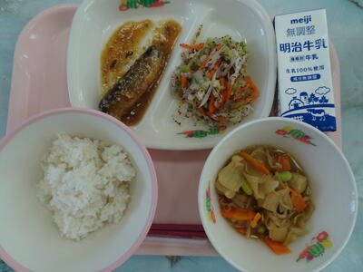 いわしのごまみそ煮・ゆかり和え・高野豆腐と野菜の炒め物・麦入りご飯・牛乳