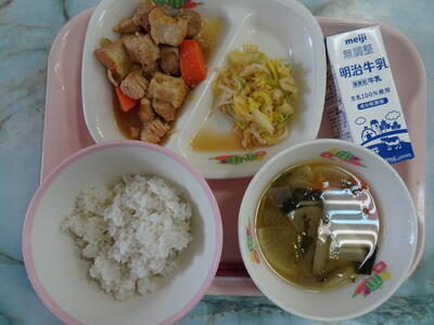 焼き鳥風あえもの・白菜キムチ・根菜のみそ汁・麦入りご飯・牛乳