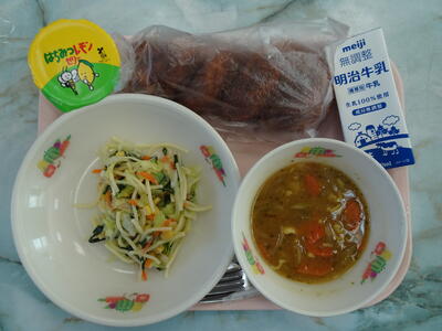 ココア揚げパン・サラダ・ABCカレースープ・はちみつレモンゼリー・牛乳