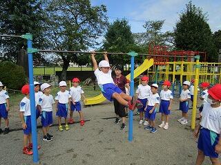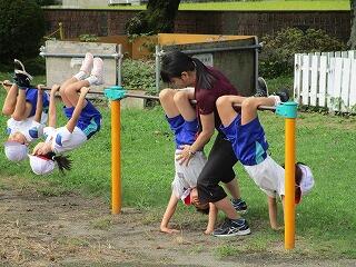 今日は久しぶりに太陽が顔を出し,やっと外で体育を行うことができました。1年生は,元気いっぱい鉄棒運動にチャレンジです。