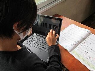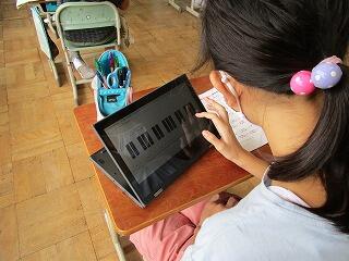教室では,子供たちがモバイルPCを上手に使いこなしています。6年生の音楽では,バーチャルピアノを使って演奏を楽しんでいました。