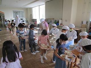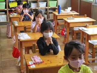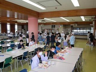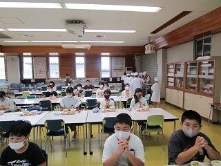 給食は,1~3年生は教室,4~6年生はランチルームです。子供たちは手を洗ったら,同じ方向を向いて座り,しゃべらず配膳を待ちます。食事中もおしゃべりはしません。コロナ対策をしっかり行っての給食です。