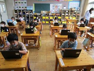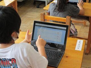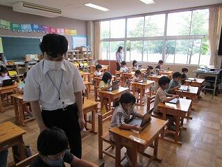 1年生が授業でタブレット端末を活用しています。担任とICT支援員の指導により,AIドリルでたし算やかけ算の問題に挑戦したり,カメラ機能を使って撮った写真を担任へ提出する練習をしたりしました。