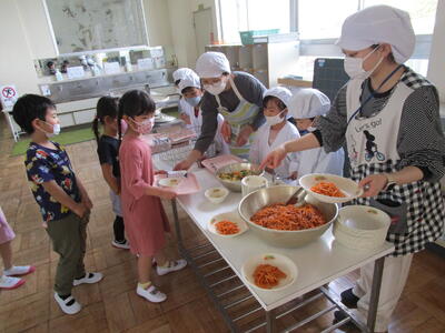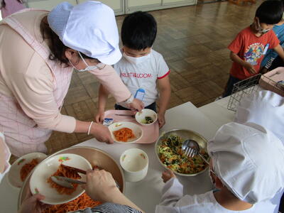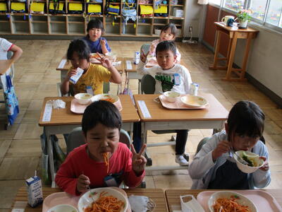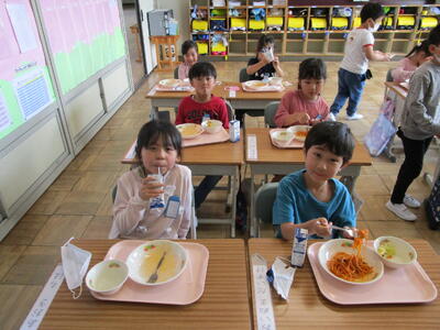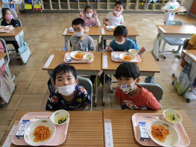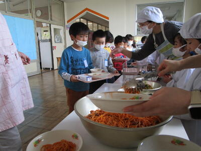 今日の献立はナポリタンと手作りフレンチドレッシングのかかったゆで野菜。どちらもしっかり食べる子が多く,ナポリタンはおかわり続出でした。モリモリ食べて,元気に学校生活を送ってほしいと思います。