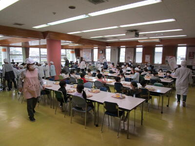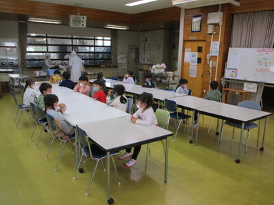 給食の流れが身に付いたので,1年生もランチルームでの給食スタートです。これで全校児童がランチルームでの食事となりました。