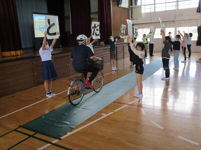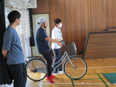 はじめに交通安全に関するお話を聞いたり,クイズを行ったりしたあと,実際に自転車を走らせて,視野が狭くなることや判断が鈍ることを体験しました。