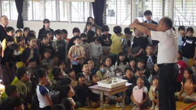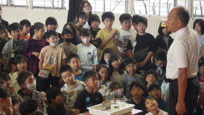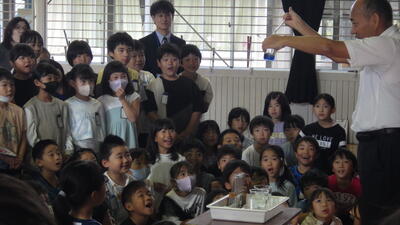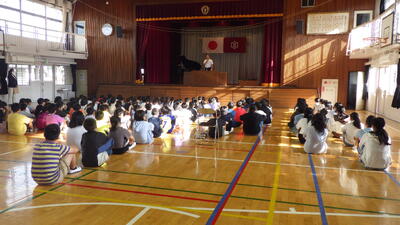 第2学期の始業式には,レベルアップについて話しました。成長には2種類あって,少しずつ変化していく自分と,急にステップアップする自分があると思います。そのことを水溶液の反応を使ってみせました。種類の異なる水溶液を加えていくうちに少しずつ変色していく様子や,ある時を境に無色な水溶液が一瞬のうちにピンク色に染まる様子に子供たちは関心を持ってくれると同時に,何も変わらないと思っていてもがんばり続けることの大切さについても考えてくれたようです。