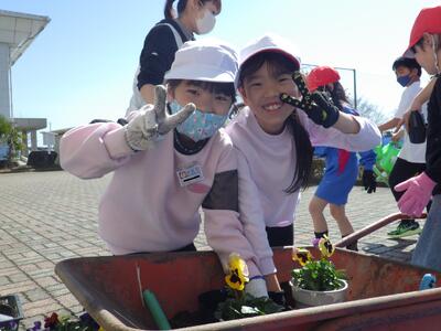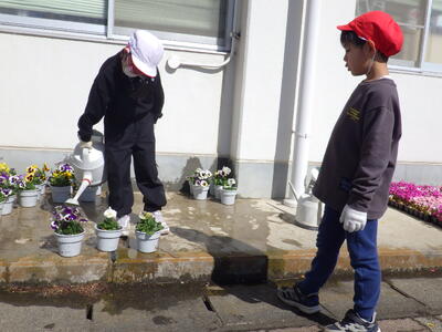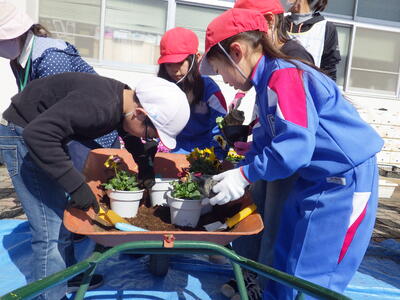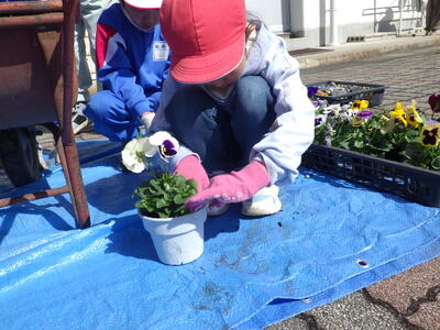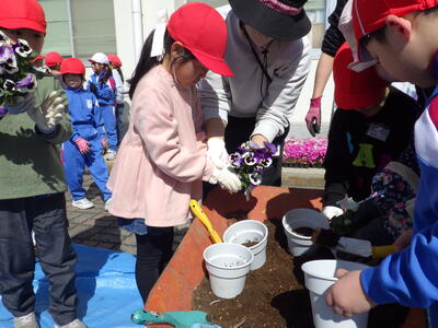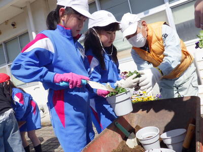 3月5日(木),1・2年生が地域の緑化ボランティアの方の協力を得て,パンジーの苗植えを行いました。