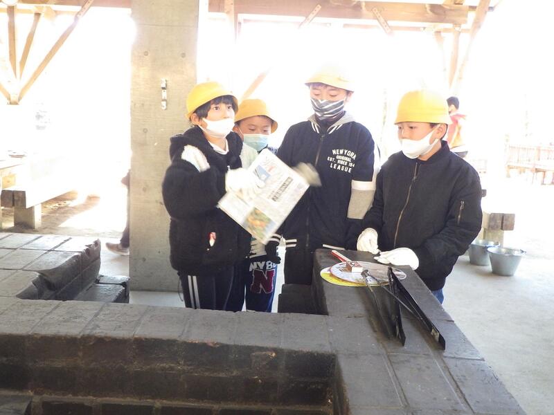 説明を聞いて,いよいよ杉板焼きに挑戦します。