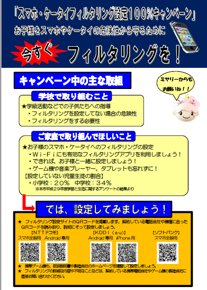 10月21日から27日まで,宇都宮市では「スマホ・ケータイ宮っ子ルール徹底週間」としております。今回のテーマは「インターネット」。とりわけ,子どもたちは,ゲーム機を通じてネット環境に触れる状況があります。そのような中で,「ネット イコール 危険」ということだけでは,今後の時代を生き抜くことは困難であると想定します。ご家庭でも,徹底週間をきっかけに,まずは,お子さんの状況を確認したり,親の失敗談を話したりしながら,リスクも知ったうえで,今後ネット環境をうまく活用していけるよう話し合う時間を設けてはいかがでしょうか。