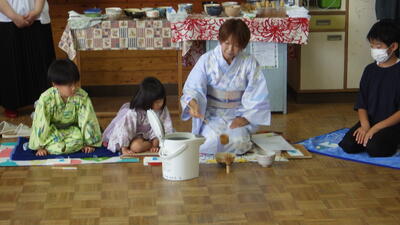 地域ボランティアの方の説明を聞き作法を学ぶとともに,お茶のたて方なども実演を交えながら教えていただき,参加した児童も体験することができました。