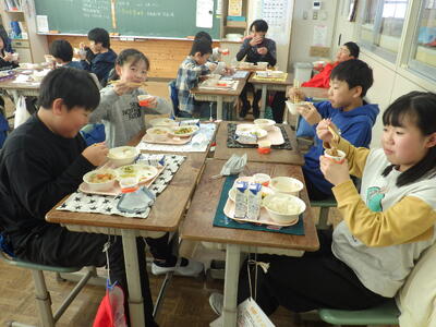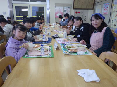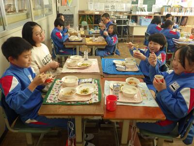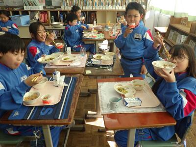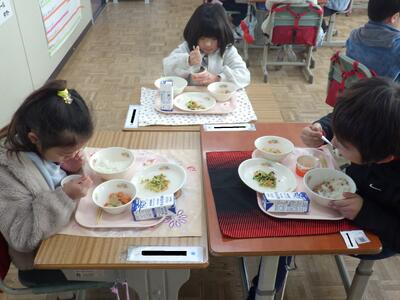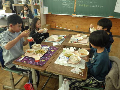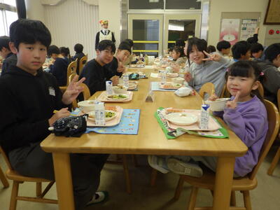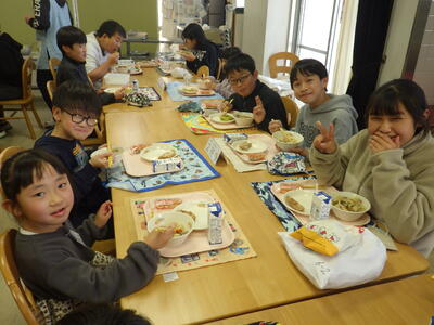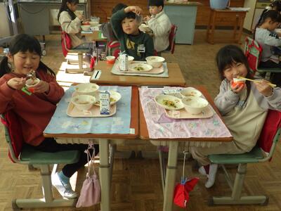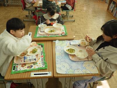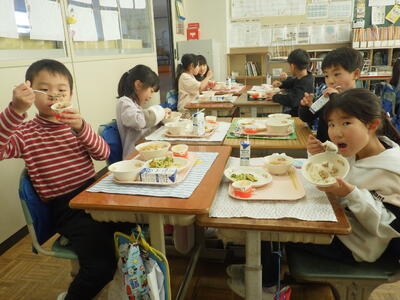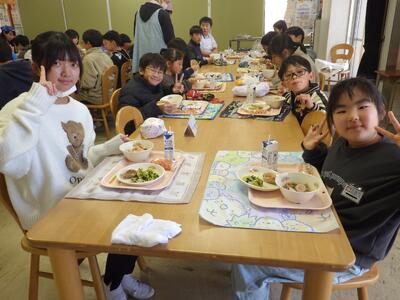12月17日(水)は,1年生と6年生がランチルームで一緒に楽しく給食を食べました。