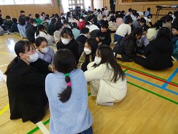 体育館でゆとりをもって座席を確保するとともに、できるだけ近くで鑑賞できるよう2部制としました。