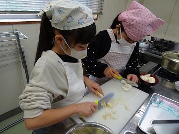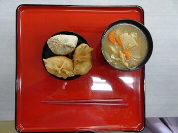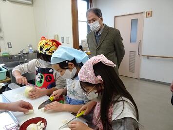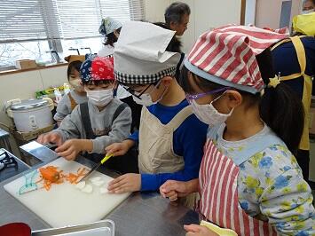 今回挑戦するメニューは、けんちん汁といなりずしでした。毎回参加している児童は包丁さばきも上手になっています。また、今回のいなりずしはかんぴょうをまき、結びました。最近ではこのような手間をかけることは少なくなったように思います。そして、できた料理は一人一人お膳に並べて試食しました。今の時代に見かけなくなった風習です。