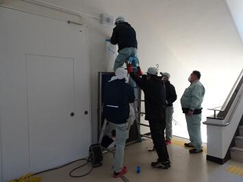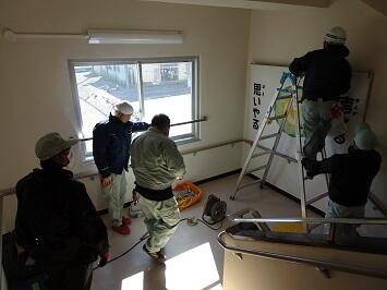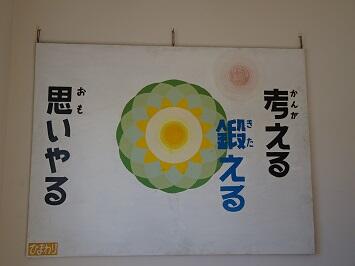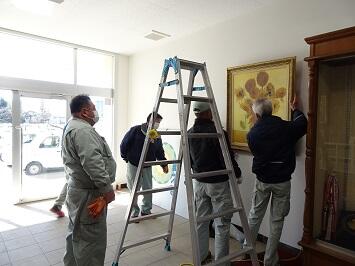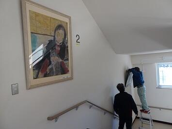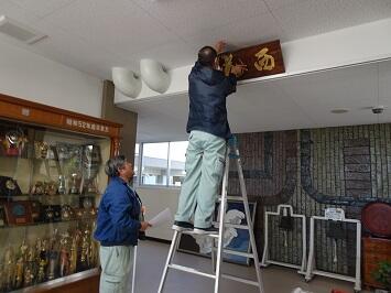 校舎改修工事で保管していた看板や絵画等を本勤務以外の方にも手伝ってもらって設置しました。廊下や階段を歩くと心がほっとする感じがします。