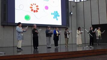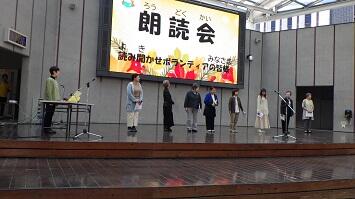 日頃からお世話になっている読み聞かせボランティアによる朗読発表です。作品は絵本「あな あな はてな」です。効果音を取り入れるとともに、児童の掛け声を求めるなど、随所に工夫が見られました。