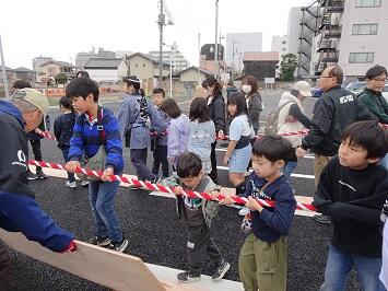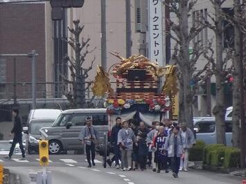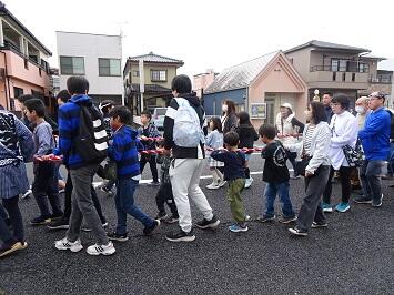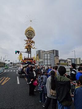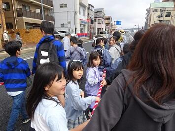 この日の午後に宇都宮地方裁判所の東側の「都心環状線」が開通するのを記念して、西地区新石町の火焔太鼓山車が地域の方の協力の下、城址公園から式典会場まで巡行しました。その地域の方のご厚意で、希望した本校児童も仲間に入れてもらい、山車を引きました。この火焔太鼓が外に出ることは稀で、その上、引く体験ができるのは貴重です。