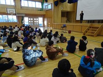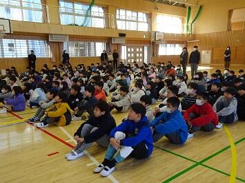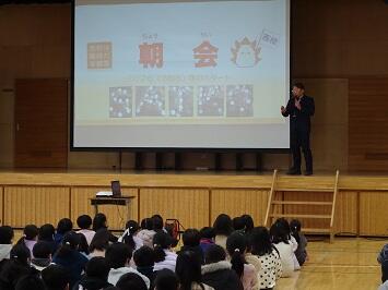 新年最初の登校日となった朝は、体育館で朝会を行いました。はじめに、転入生を紹介し、5日に着任した学校栄養士業務にあいさつをしてもらいました。