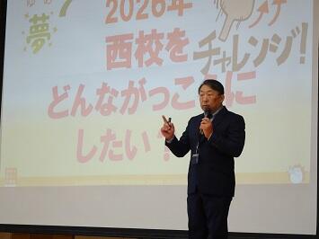 そして、校長の話です。今回は元旦の新聞に掲載された集英社100周年の広告を引用し、今年で創立148年を迎える西校をどのような学校にしていきたいか訴えました。学校は教職員だけでなく児童によっても創られることを意識させたく、後日、アンケートを取ることを予告しました。素直な児童の考えを期待しているところです。