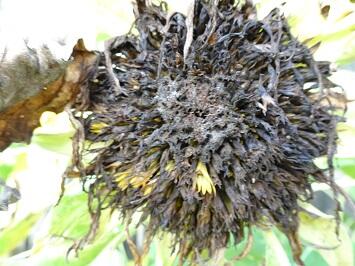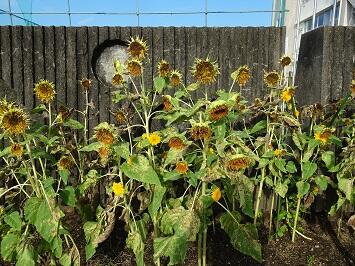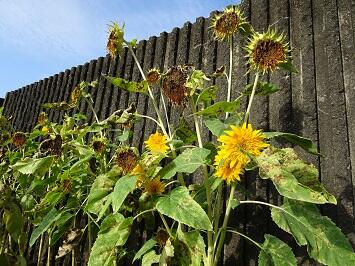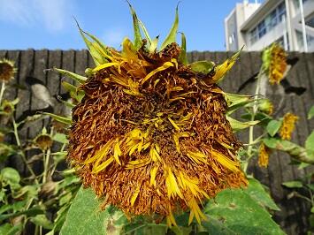 満開だったヒマワリはあっという間に枯れ始め、今は種ができつつあります。なかには、まだ明るく咲いている花も少しあり、ひときわ目立ちます。