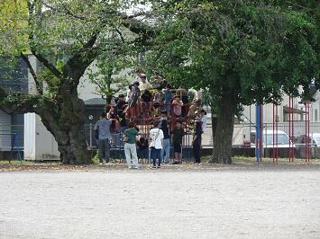 毎週水曜日は全児童が校庭に集まった後、班ごとに下校しています。登校班担当教員の注意事項を聞いて、子どもの家に児童と野球の練習に参加する児童を除いて一斉に門を出ました。