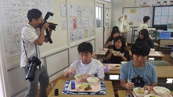 暑い日が続いていますが、給食時に当番はきちんと身支度をして配膳しています(5学年)。また、その暑さに負けないよう、3年生はもりもり食べていました。