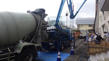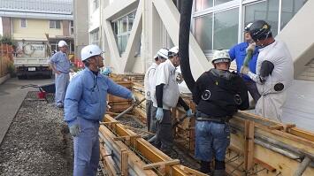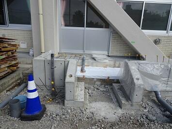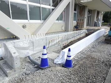 南校舎来賓玄関入口にはスロープができます。この日は、枠組みにコンクリートを流し込む作業をしました。