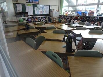 今回の訓練は、不審者が昇降口付近をうろつき、職員の声掛けにも応じず校舎内に入り、西階段を上り3年教室に向かうところを教員が確保する内容にしました。3年児童は担任の指示により教室内を学習机で入口にバリケードを作って窓際で待つ動きをしました。他学年は不審者侵入から確保までの模様をテレビで視聴しました。