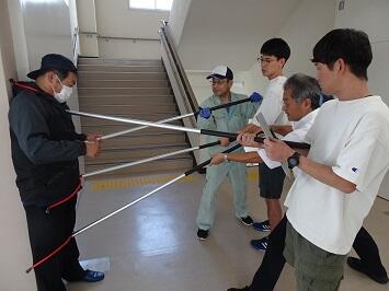 この日は、はじめに自己紹介をして、災害時における開設までの連絡体制や初期支援の仕方について確認しました。その次に、体育館に入り冷暖房の付け方、備蓄庫内部の物品等の確認などを行いました。