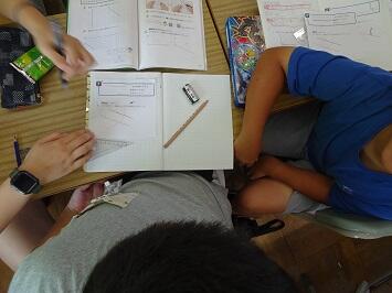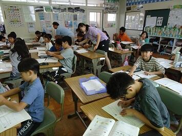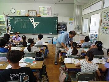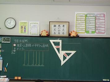 算数で垂直と並行を学習していますが、ここでは2つの三角定規つかって作図を授業でした。担任と学力向上担当教員2名がティームティーチング方式で指導に当たりました。できるだけ多くの児童の作図を確認し、助言を支援をしました。必死に取り組む児童の姿が印象的でした。