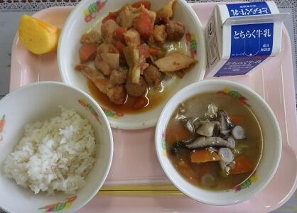 今日はハロウィーンということで、デザートにかぼちゃ蒸しパンを付けました。かぼちゃ蒸しパンは調理員さんの手作りです。かぼちゃの自然な甘みが感じられて、とてもおいしかったです。児童からも好評でした。