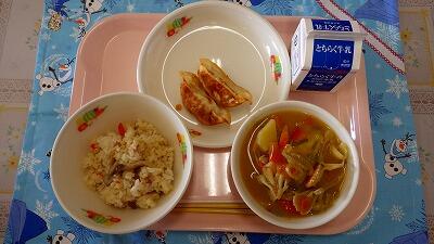 現在給食では、加熱調理後の二次汚染を防ぐため、ゆで野菜は献立に入れることができません。今日はゆで野菜のかわりに、小松菜とじゃこを使った煮びたしが出ました。苦手な児童が多かったようですが、とても栄養のある一品です。