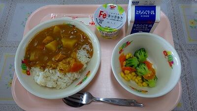 今日から1年生の給食開始です。初日は児童に人気のあるカレーにしましたが,1年生の残食はゼロでした。