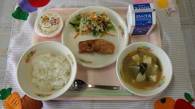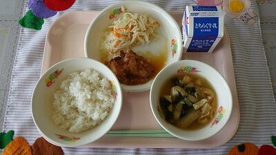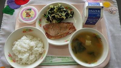 初日の今日は「栃木献立」です。私たちの住む栃木県でとれた食材を多く入れました。お米、牛乳、豚肉、ほうれん草、里芋、ねぎ、小松菜が栃木県の食材です。