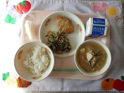 今日は給食委員会の6年生が考えた献立です。「6年生が本気で美味しい」と思ったものをテーマにし、給食ポストのリクエストに入っていたものもあわせて考えました。味噌けんちん汁には、特別に鶏肉が入っています。