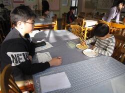 給食委員会が企画・運営して、「豆つかみ大会」が開催されました。