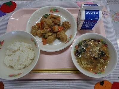 今日は十三夜献立で、栗おこわを出しました。栗は、宇都宮市の北條農園さんのもので、調理員さんが一つ一つ手でむいて作ってくださいました。栗が苦手と言っていた児童も、「甘くて美味しかった!」と完食することができました。