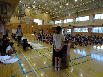 全員が体育館に集まり、代表委員会企画によるいじめゼロ集会を行いました。