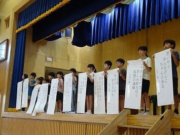 はじめに、「いじめゼロ標語」の中で優秀賞に選ばれた作品を作者がステージの上で披露しました。