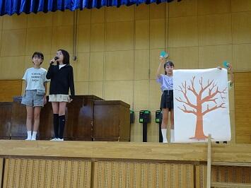 最後に、西校からいじめが起こらないための企画を代表委員が紹介しました。昇降口付近に大きな木を掲げ、友達からされてうれしかったことや言葉を葉っぱに書いてその大木に付けていくものです。期間中にどれだけうれしさの葉が増えるか楽しみです。本ホームページでも経過を報告したいと思います。
