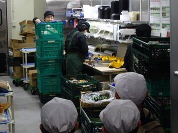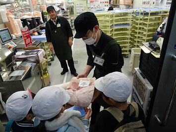 現地で2つの班に分かれて、普段見ることができないスーパーマーケット店舗裏側にあるバックヤードを見たり、隣接するサービス館内に入り施設について説明を聞いたりしました。