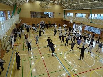 はじめに、参加者が体育館に集まり開会式と準備運動を行いました。そして、全員で集合写真を撮影しました。