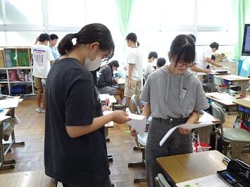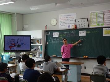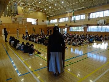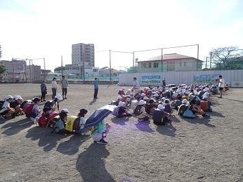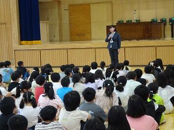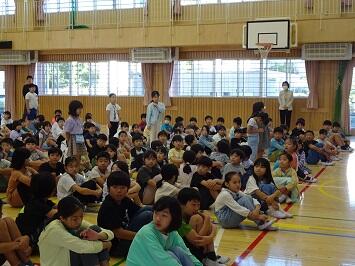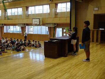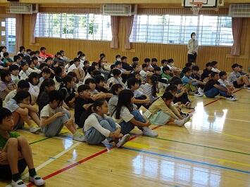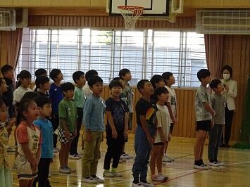 次に、校長からの話です。大きく2つのことについて話しました。1点目は「できた」、「やったー」、「分かった」などの小さな成功をどのくらい積み重ねることができたか振り返ってみようということです。そして、よくできなかったことは反省して、2学期から頑張ろうと伝えました。2点目は、人や物に対して思いやりの心をもって生活しようです。西校の教育目標の一つに「思いやる」があります。学校生活においては常に友達に思いやりの心で接すること、また、2学期から南校舎を使いますが、校舎や物にも思いやりの気持ちで生活することを伝えました。