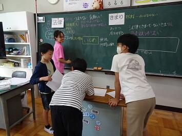 法律やきまりは何のためにあるのか、法律がなかったらどんな生活になるのかなど、いじめと関連させた内容でした。