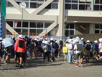 薄い雲が流れる秋空の下、一斉下校を行いました。日差しが体に当たるものの、気持ちよい気候です。