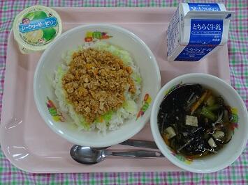 <こんだて>むぎいりごはん、タコライス、ぎゅうにゅう、とうふともずくのスープ、シークヮーサーゼリー