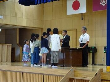 式典後は、表彰を行いました。内容は市教育長奨励賞及び新体力テストS認定証の伝達、そして、過日、きらり賞を受け取った児童を全児童の中で紹介しました。